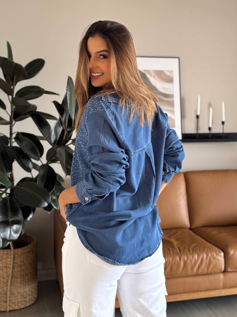 Camisa en tencel manga larga, con detalle de brillos que aporten un toque de brillo sutil y elegancia. perfecta para elevar tus looks casuales con estilo y frescura