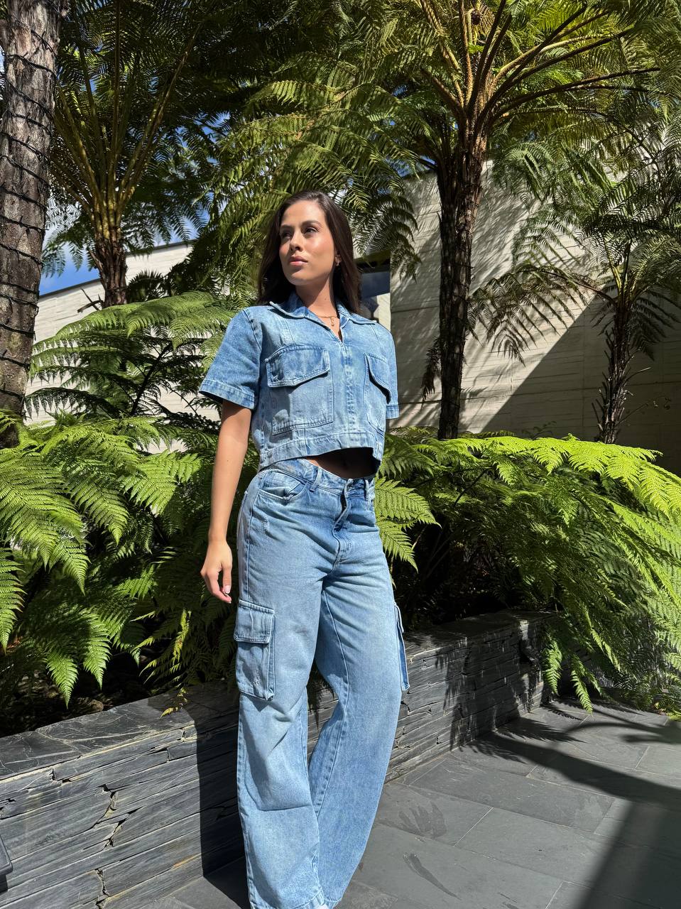 Conjunto blusa tipo cajón y pantalón cargo- Talla: S Tela: índigo