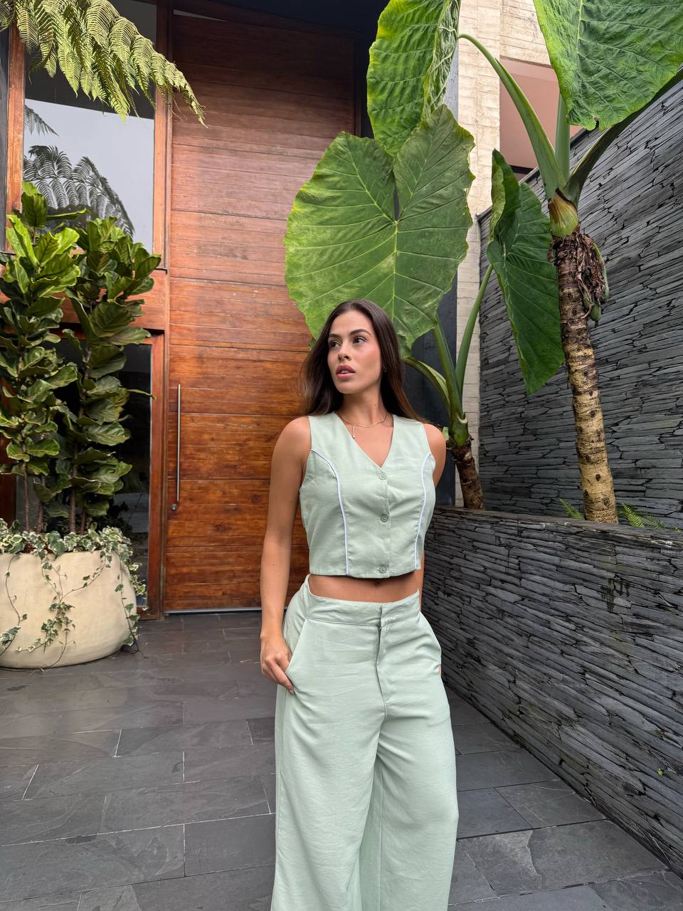Conjunto pantalon y blusa con detalle de amarre en espalda , Tela: mykonos- Tallas S-M-L Colores: Verde- Blanco- Camel