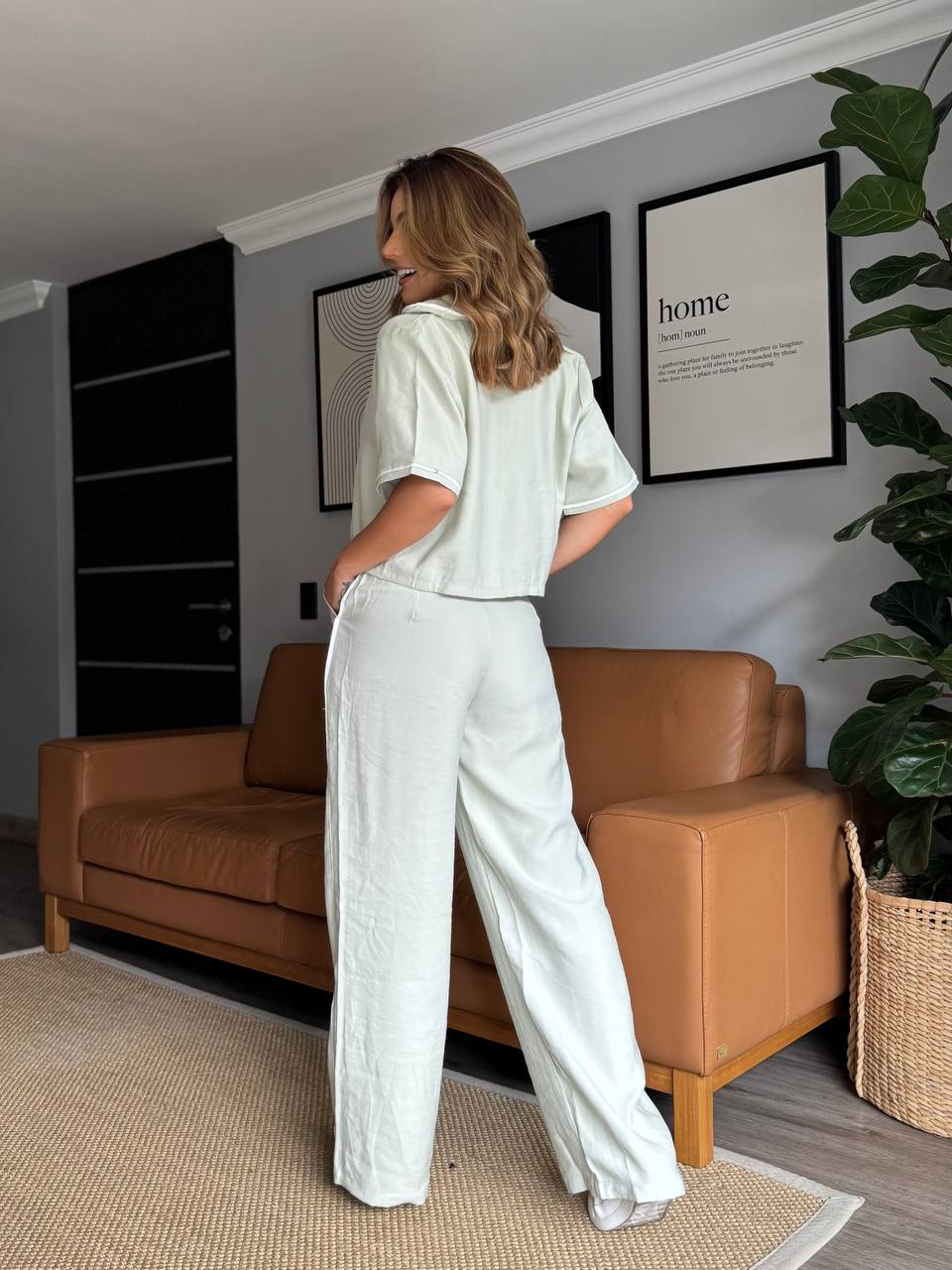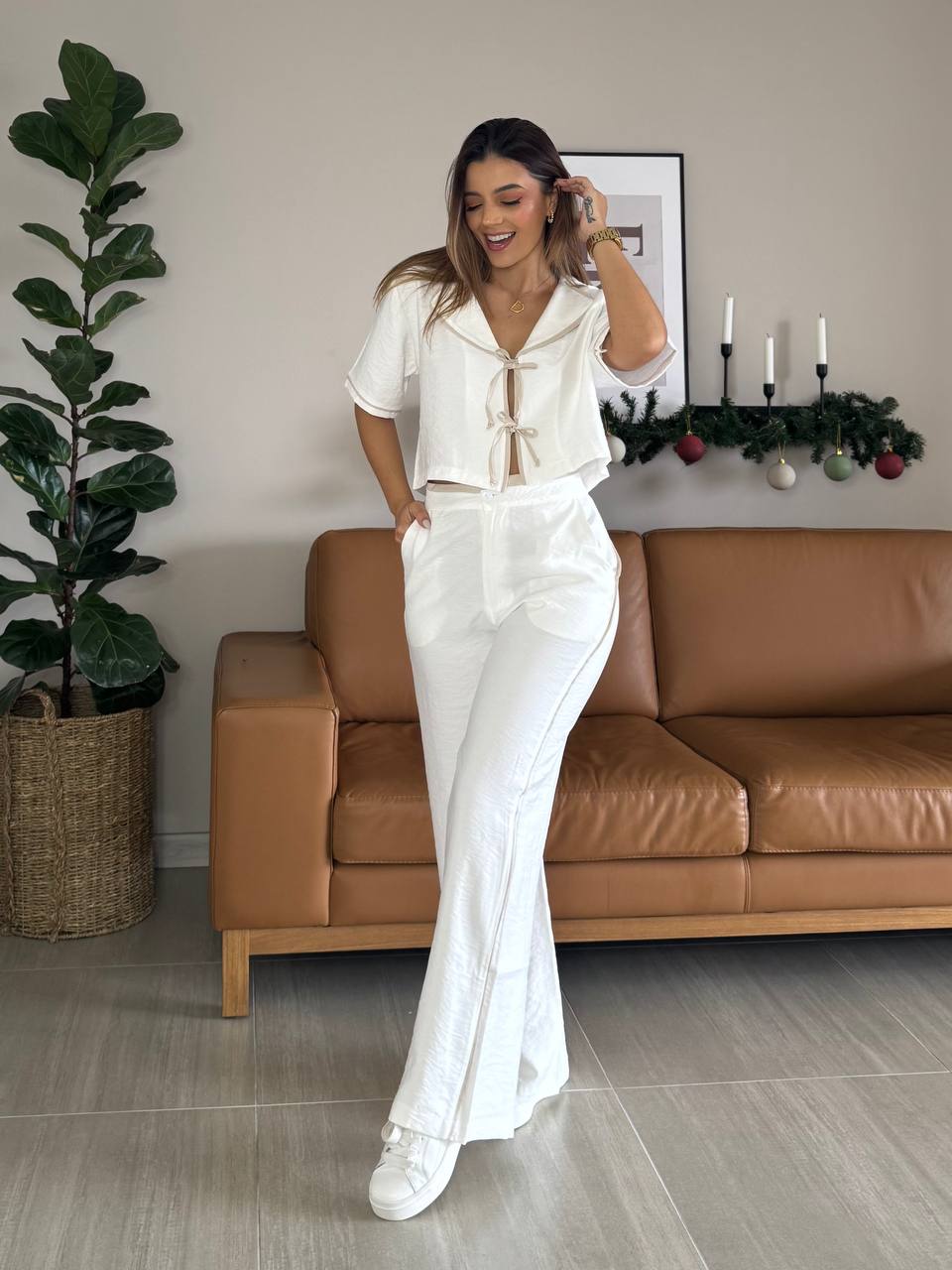 Conjunto pantalón tiro alto, blusa con amarre-