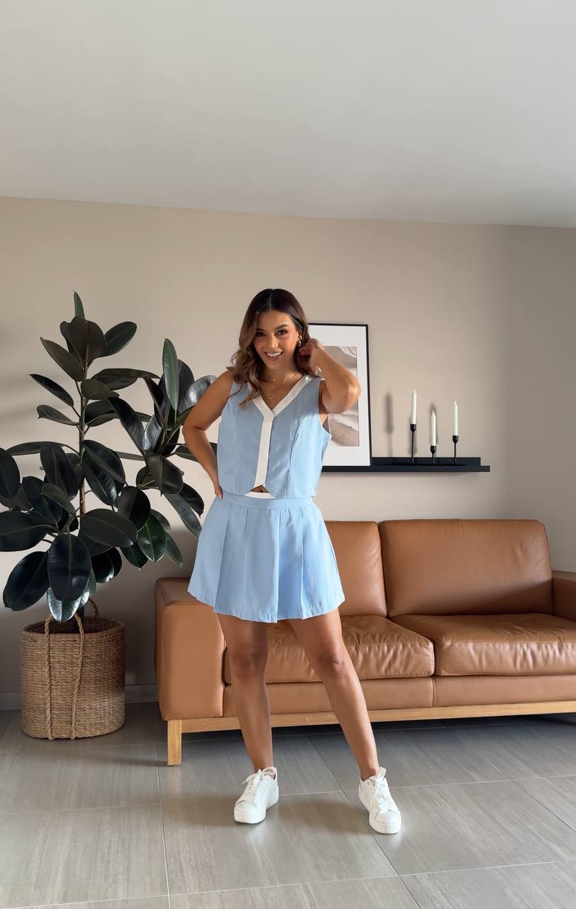 Conjunto chaleco y falda Short- Tela: Mykonos- Tallas: S-M-L COLORES: Azul- Negro- Blanco- Beige