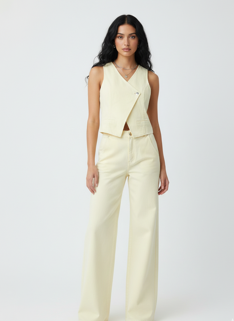 Conjunto de Chaleco asimétrico sin mangas con detalle cruzado al frente y pantalón de tiro alto con bota amplia que estiliza la figura. Un look minimalista, versátil y sofisticado, perfecto para destacar con elegancia en cualquier ocasión.