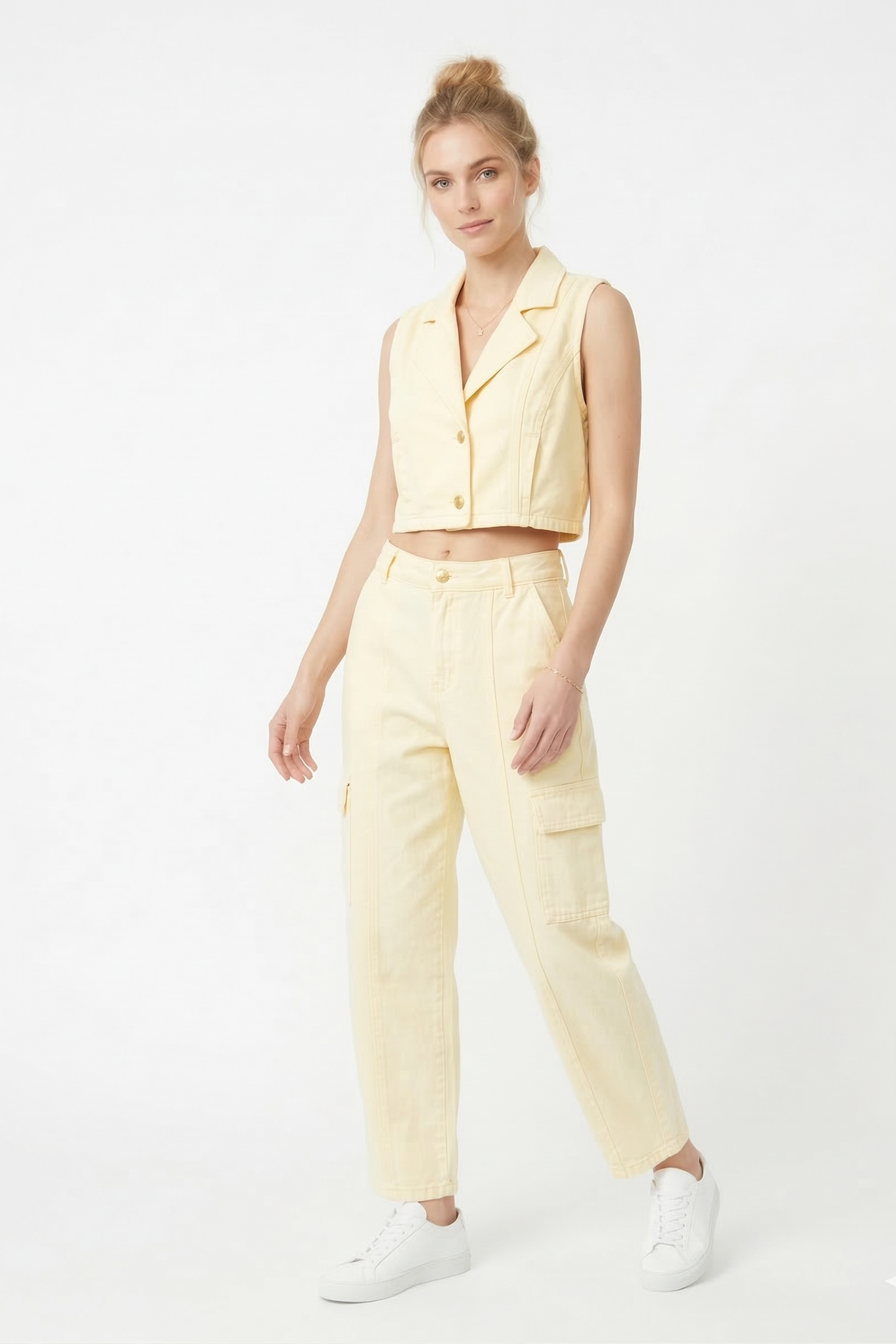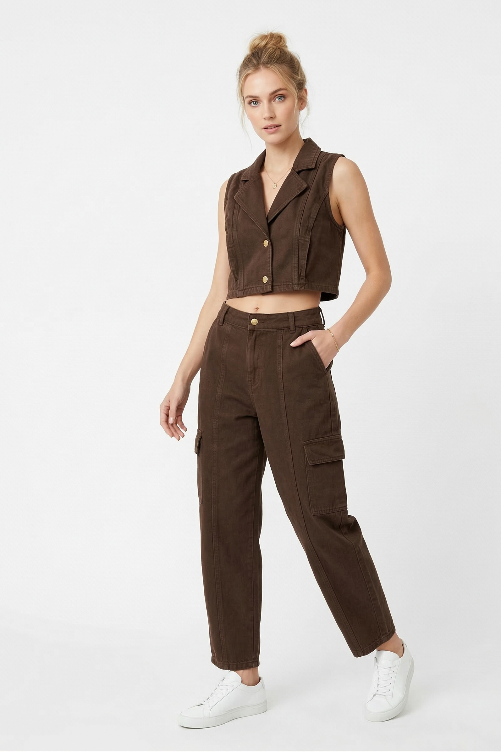 Beneficio funcional: Pantalón cargo tiro alto, pierna amplia que se ajusta hacia una bota recta corta tipo tubo, con bolsillos laterales , y chaleco sin mango tipo sastre que brinda equilibrio, comodidad para un estilo clásico y urbano.