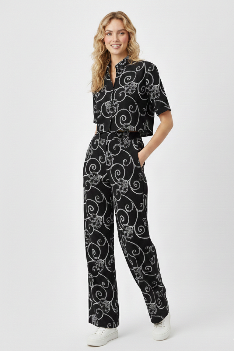 Conjunto pantalón tiro alto y blusa tipo cajón crean crean un diseño moderno, versátil y fácil de combinar, su tela tiene un delicado diseño bordado que le da un toque elegante y diferente sin perder el estilo. Este Look que se roba todas las miradas sin esfuerzo