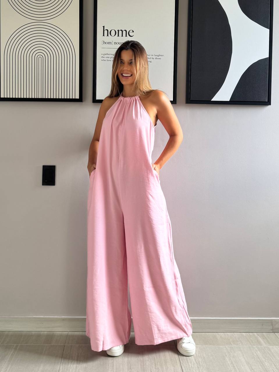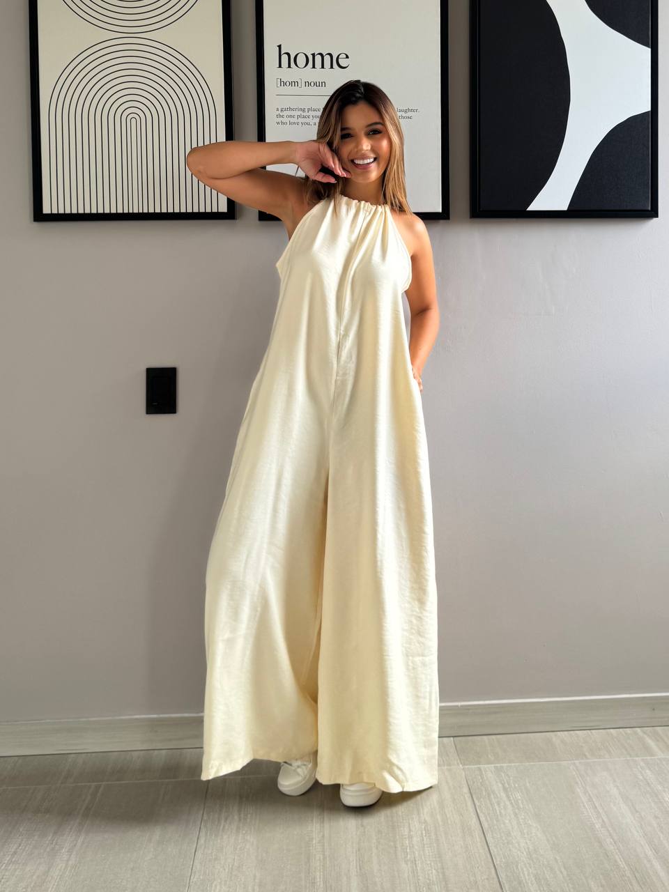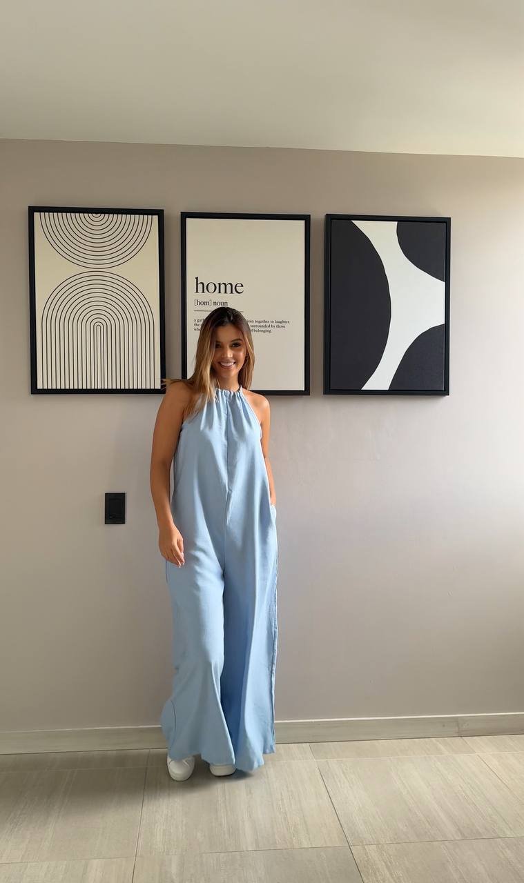 Enteirizo largo con cordón de amarre en el cuello- Tallas: S-M-L Color: Rosa- Amarillo- Azul- Café - Tela: Mykonos