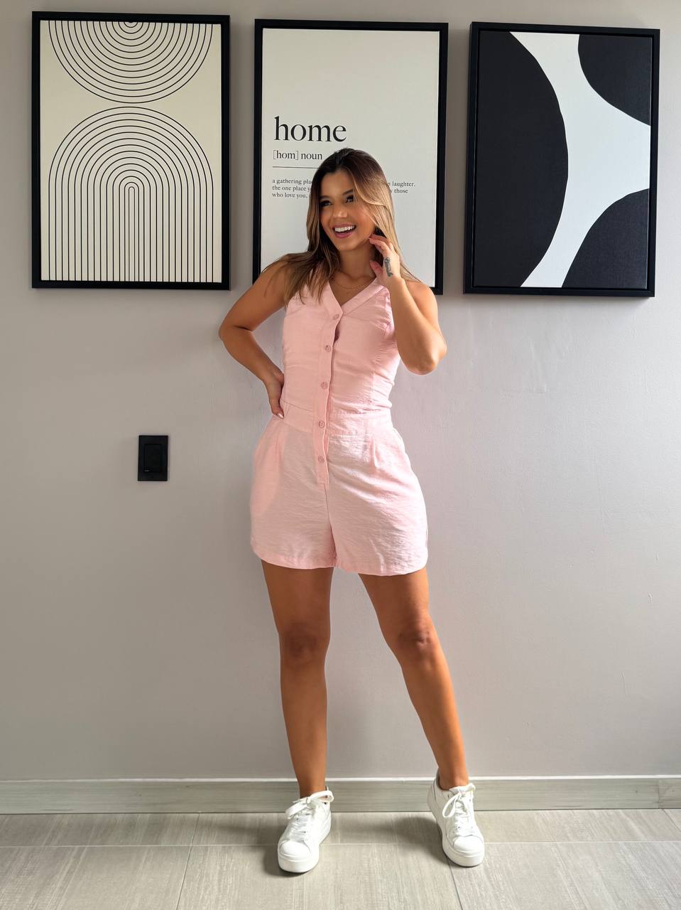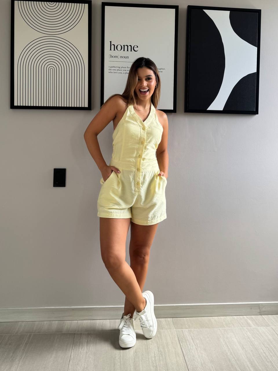 Enterizo corto con detalle de amarre en la espalda- Tallas M-L Colores: azul- Rosa- Amarillo