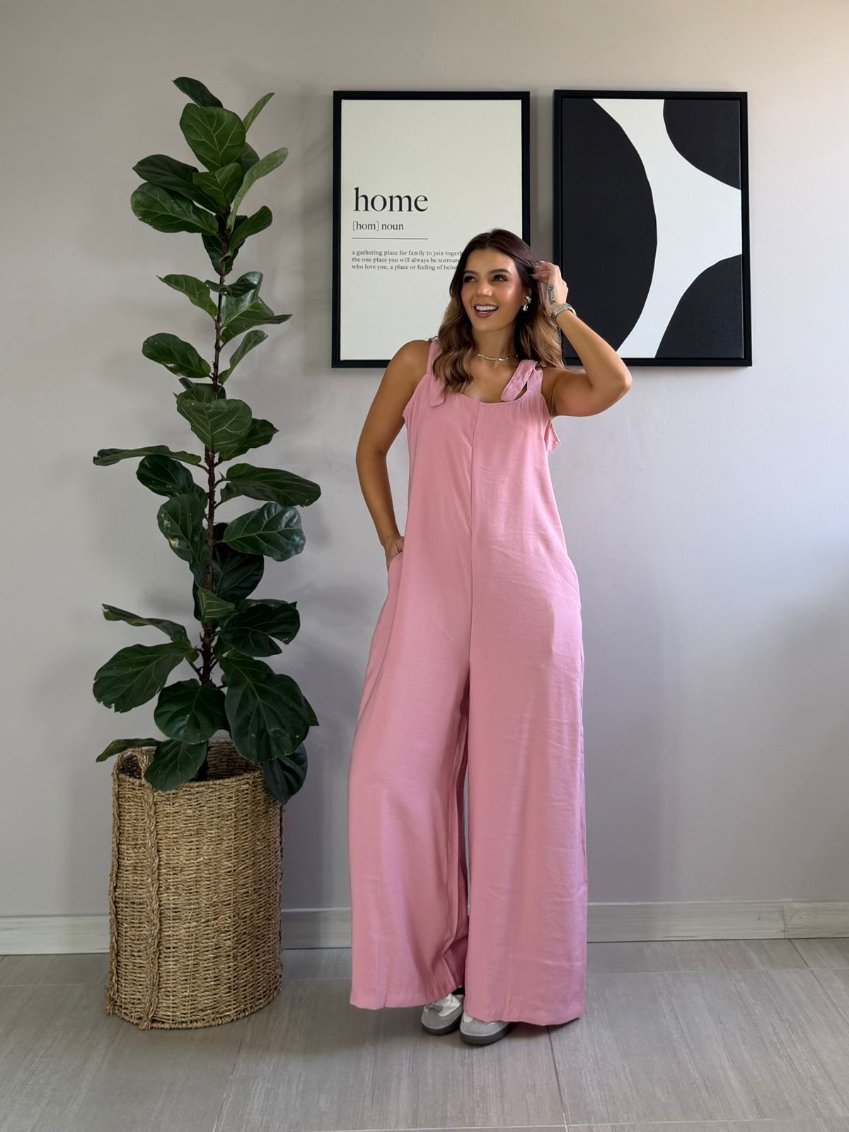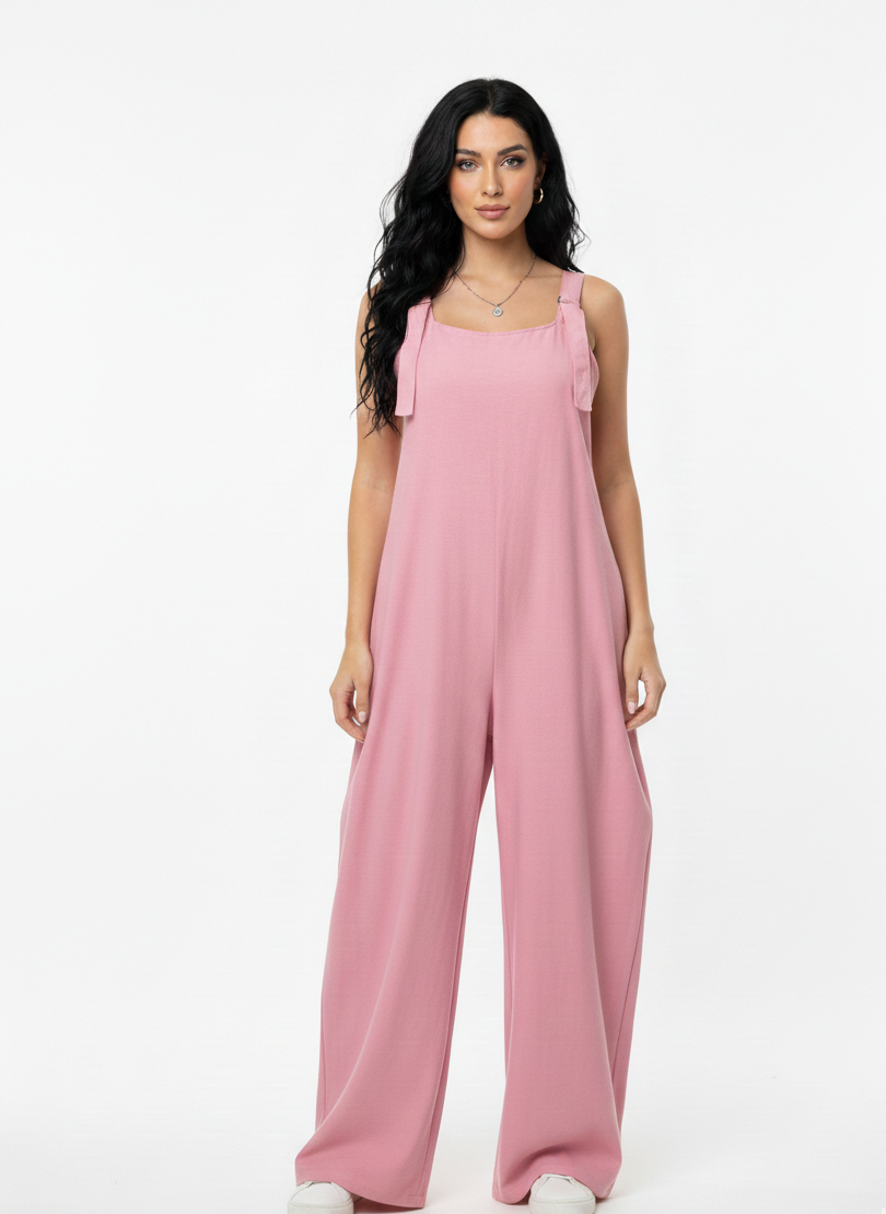 Beneficio funcional: Enterizo largo de bota ancha, bolsillos laterales , que brinda comodidad, cuenta con tira ajustable en los hombros, No lleva ajuste en la cintura, lo que lo hace fresco, relajado y perfecto para un look casual moderno.