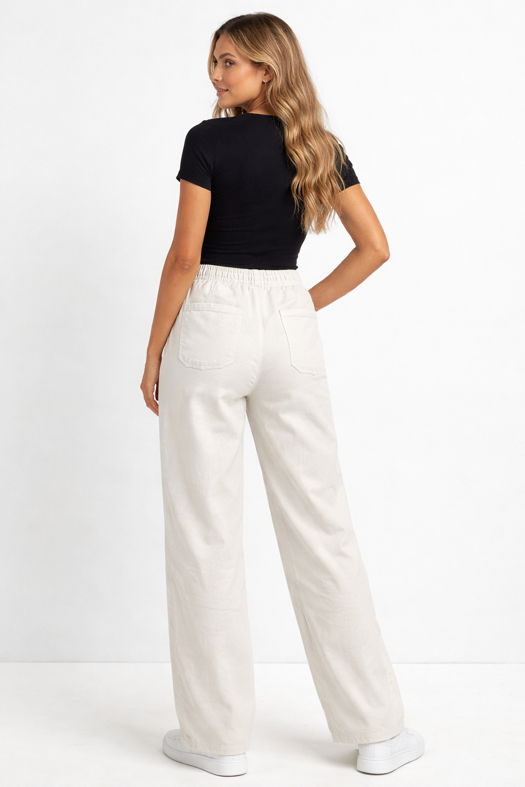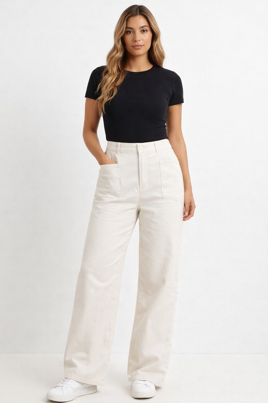 Beneficio funcional: Pantalón tiro alto y bota ancha, con bolsillos y resorte en la parte de atrás para mas comodidad, su diseño lo hace vérsatil para ir a la oficina o salidas casuales,
