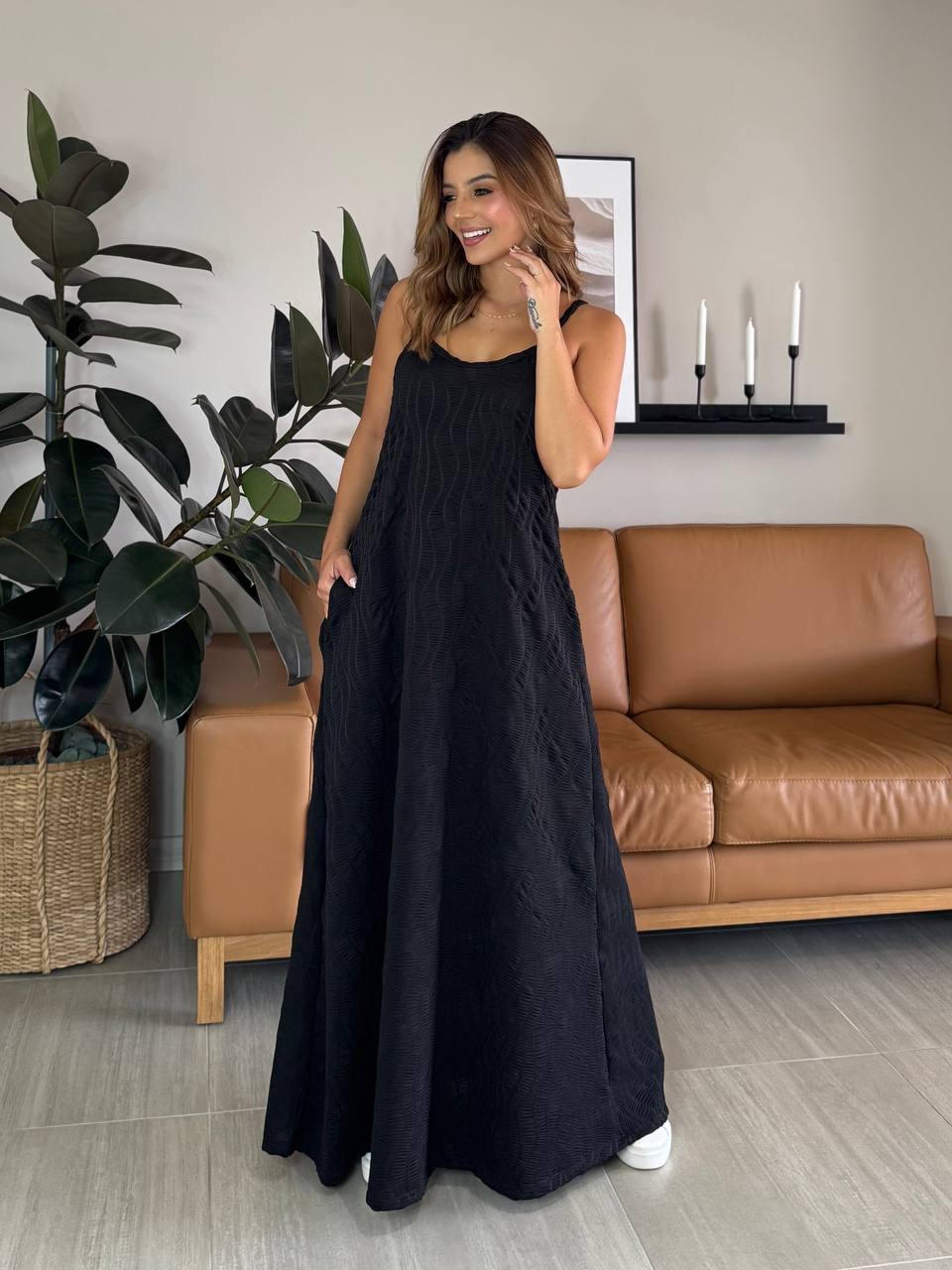 Vestido largo con textura- Tela: Poliéster y Spandex - Tallas: S-M-L - Colores: Café- Beige- Negro